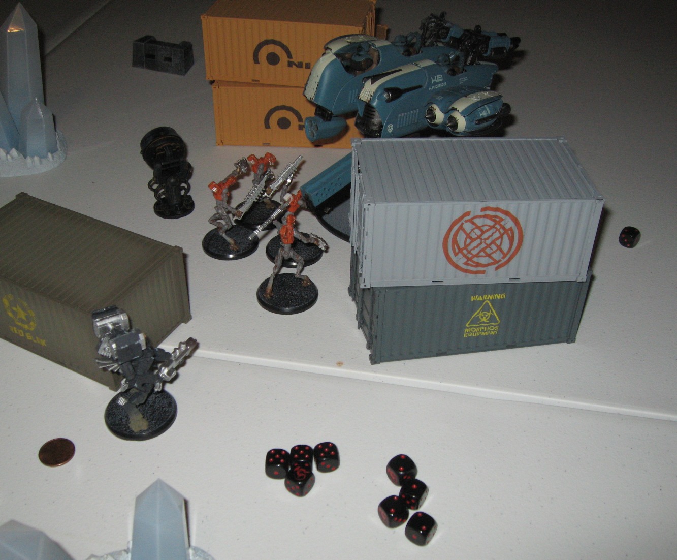 The Kaptars move forward and surround an objective marker and then fire at the Cog Infiltrators dealing 5 hits, they Infiltrators take 1 wound.